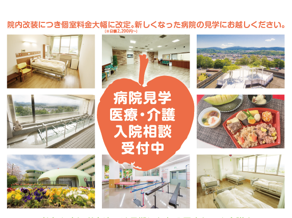 当院では、「人を知り、人を診る。家族を知り、患者さまとともに。」をスローガンに、全職員が一丸となって、患者さまが穏やかな毎日が過ごせて、ご家族さまが何度も面会に来たくなる病院づくりに取り組んでいます。