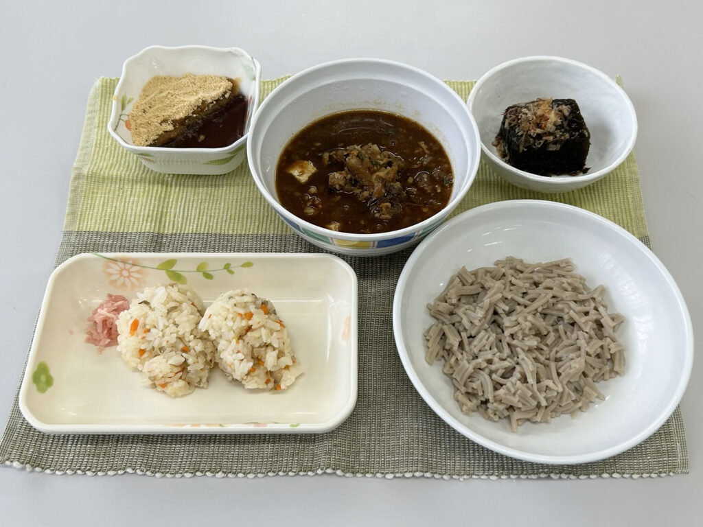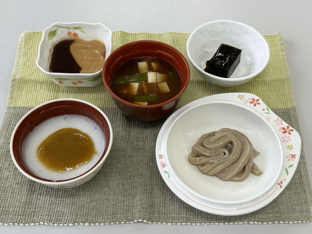 12月の「郷土料理」掲載致しました 2026/01/05 / 郷土料理 茨城県 五目いなり寿司は地元で取れる農作物を使っています。 茨城県では江戸時代からそば栽培が盛んでした。 また根菜類がよくとれることからけんちん汁もよくつくられていて けんちん汁にそばを付けて食べるのが習慣になりました。今回は赤みそのけんちん汁にしました。 海藻よせは正月に欠かせない料理でおせち料理の箸休めとして重宝されています。 みためぼたもちは第一子の赤ちゃんが産まれて3日後に食べる大きなぼたもちです。 きざみ食 ミキサー食