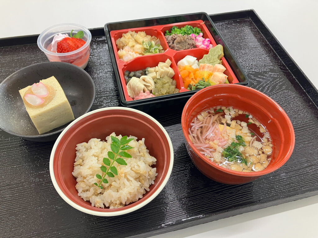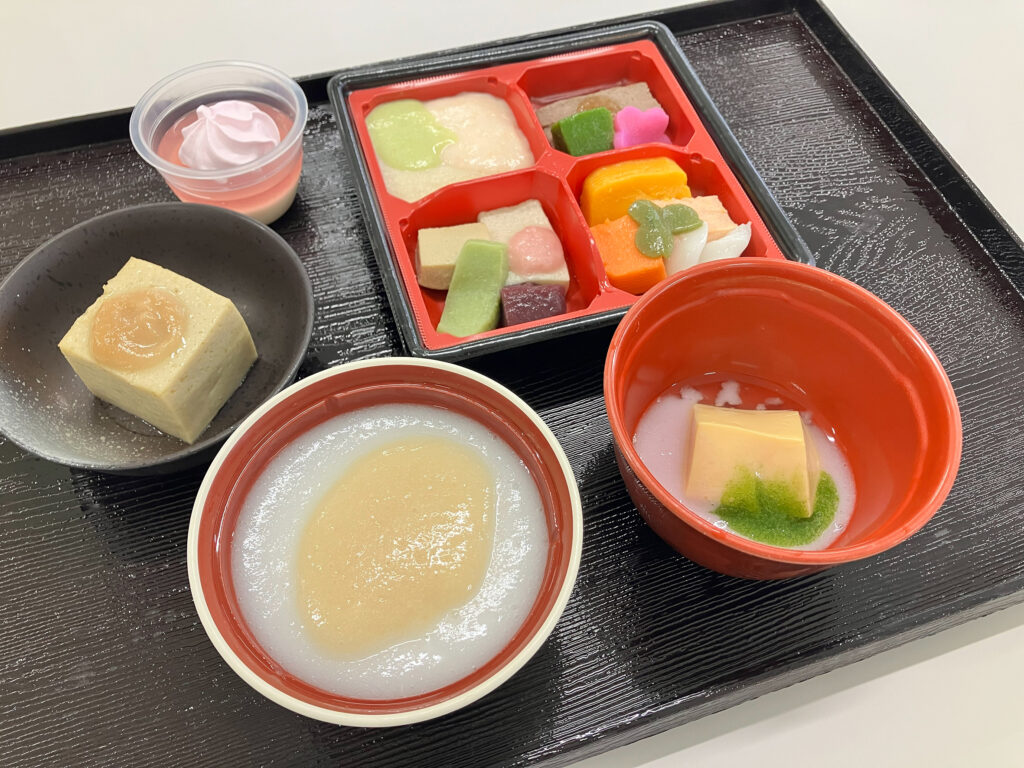 4月の「お花見膳」掲載致しました 2026/04/06 / 郷土料理 お花見膳 4月4日はお花見膳をご用意いたしました。 春の味覚であるたけのこご飯を中心に、彩り豊かな天ぷらや焼き物、 やさしい味付けの煮物をご用意いたしました。 汁物には風味豊かなすまし汁を、デザートには桜の風味香る2層のプリンを添え、 季節感あふれるメニューとなりました。 見た目にも華やかな春のひとときを、お楽しみいただきました。 きざみ食 ミキサー食