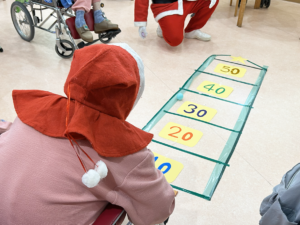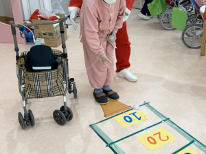 高得点を目指してボールを転がし、病棟は笑顔と声援で大盛り上がり。