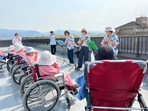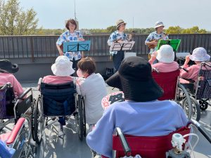ウクレレ演奏を屋上で(かつらぎ南3病棟) 2025/04/23 / イベント ある晴れた日、来ていただいているボランティアのウクレレ「ミノアカ」の方々に 屋上で演奏していただきました。 「小川」や「花」などの春の歌から「川の流れのように」などのたくさんの曲を 演奏していただき、患者さまも気持ちよさそうの合唱されていました。