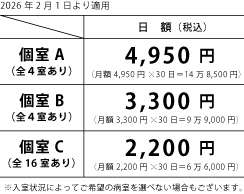 2026年2月1日より個室の料金を下記の通り改定させていただきます。