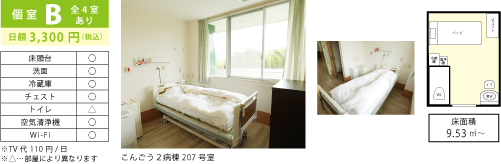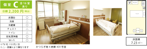 下記個室は一例です。広さおよび設備のレイアウト等は病室により異なります。