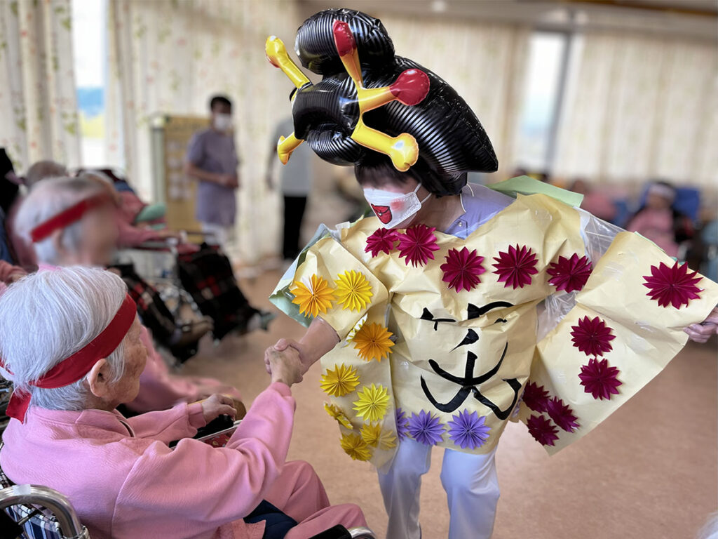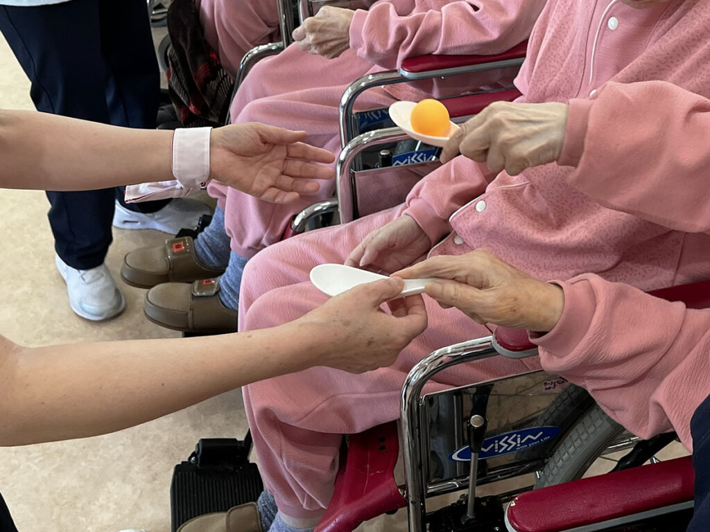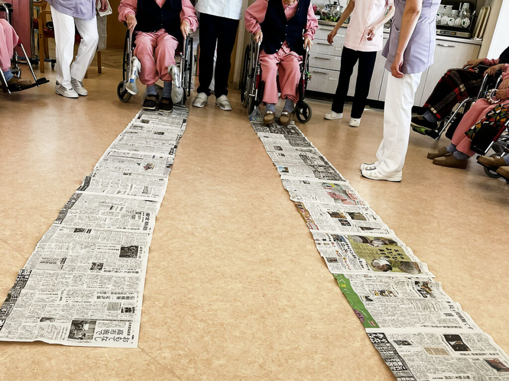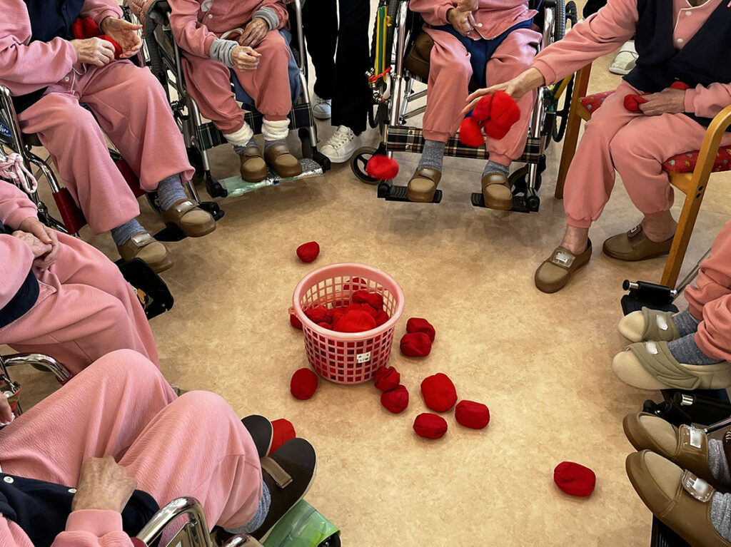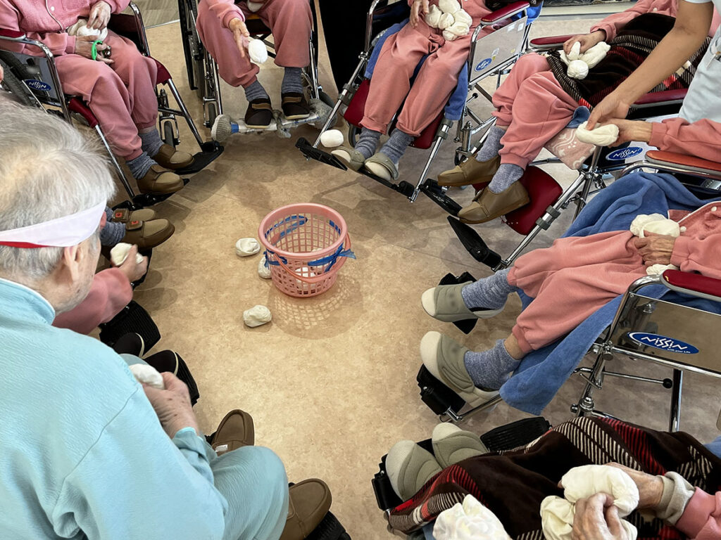 運動会(こんごう3病棟) 2025/11/27 / イベント こんごう3病棟で運動会を開催しました。 赤組・白組に分かれて、玉入れやピンポン玉リレー、新聞引き寄せゲームなど どの競技も白熱し、患者さまも職員も一緒になって大盛り上がりでした。 名物キャラクターの紀州梅子さんも登場し、 大盛況のレクリエーションとなりました。
