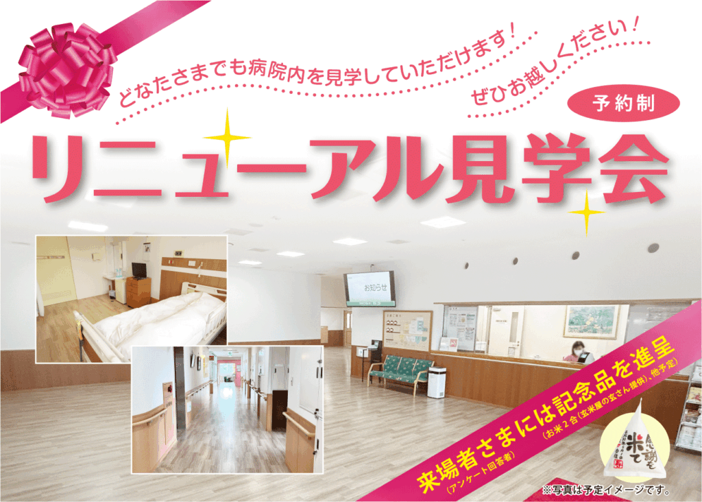 このたび老寿やすらぎ病院の改装工事完了を記念して、病院・介護事業所さま、一般の方を対象に、下記日程にてリニューアル見学会を開催いたします。一般の方も入院・相談に関係なく一度病院内を見てみたいという方や興味本位の方でも大歓迎です。見学終了後アンケートにお答えいただいた方には記念品をプレゼントさせていただきます。ぜひご来場ください。お申込みお待ちしております